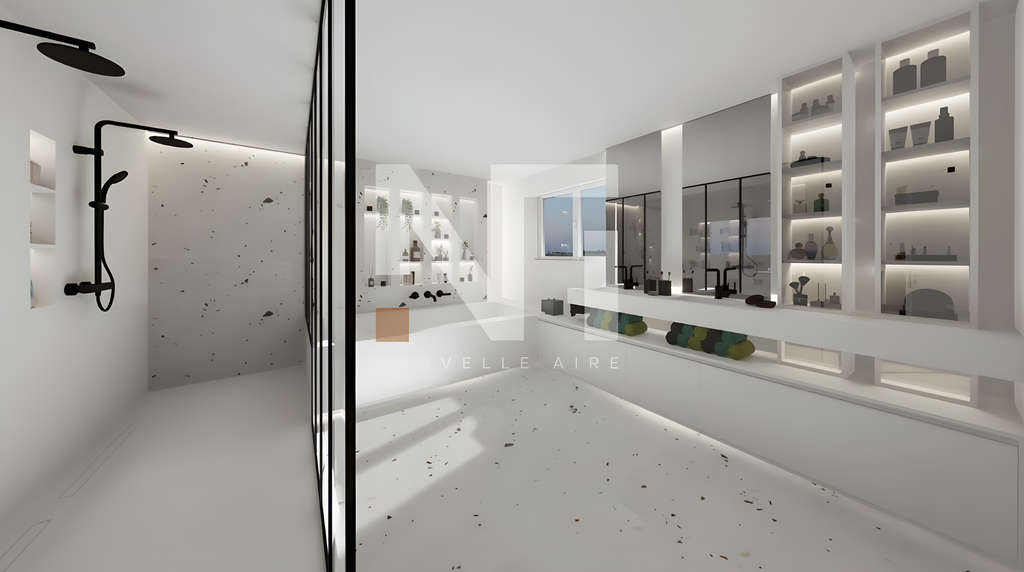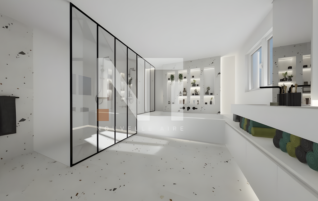 Côté ambiance, nous avons opté pour des tons blancs lumineux et apaisants, rehaussés par une note de terrazzo coloré. Ce petit twist subtil qui fait toute la différence, sans jamais lasser.