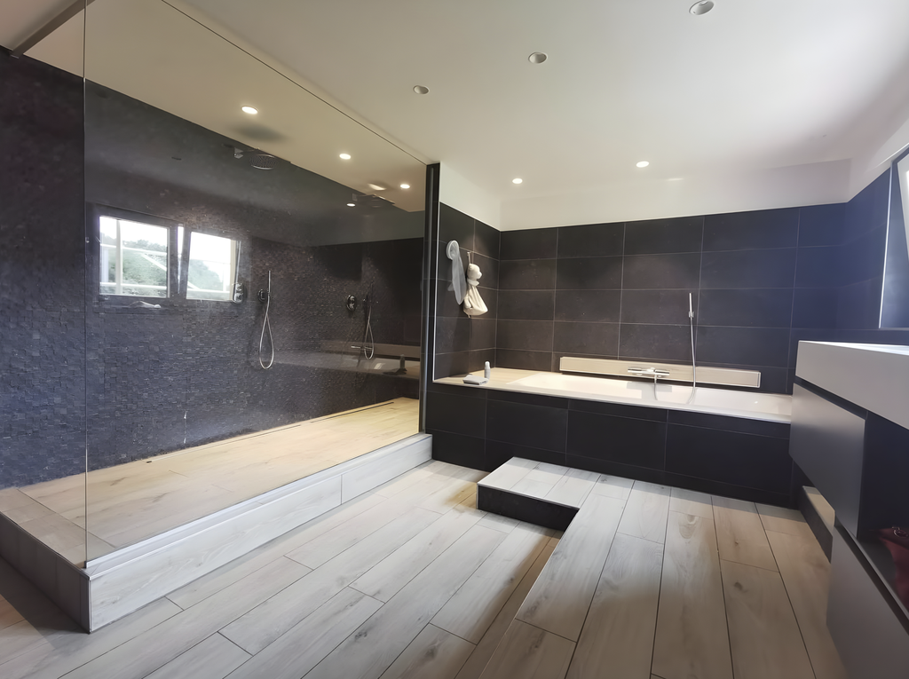Le sol a été entièrement nivelé pour facilité la circulation et pour permettre l’intégration d’un receveur de douche affleurant, apportant modernité et confort d’usage.